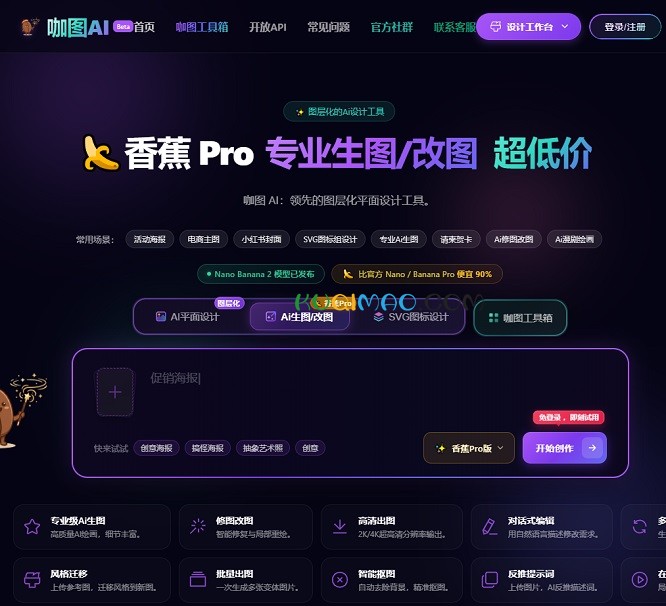 咖图AI是一款面向设计师、营销人员及内容创作者的专业级AI图像设计工作台。平台深度融合人工智能与图形设计技术,致力于为用户提供高效、智能、灵活的视觉创作解决方案。kuqimao.com其核心功能涵盖AI智能生图、精细化图像编辑、图层化海报设计以及高质量SVG矢量图标生成等模块,全面覆盖从创意构思到成品输出的完整设计流程。